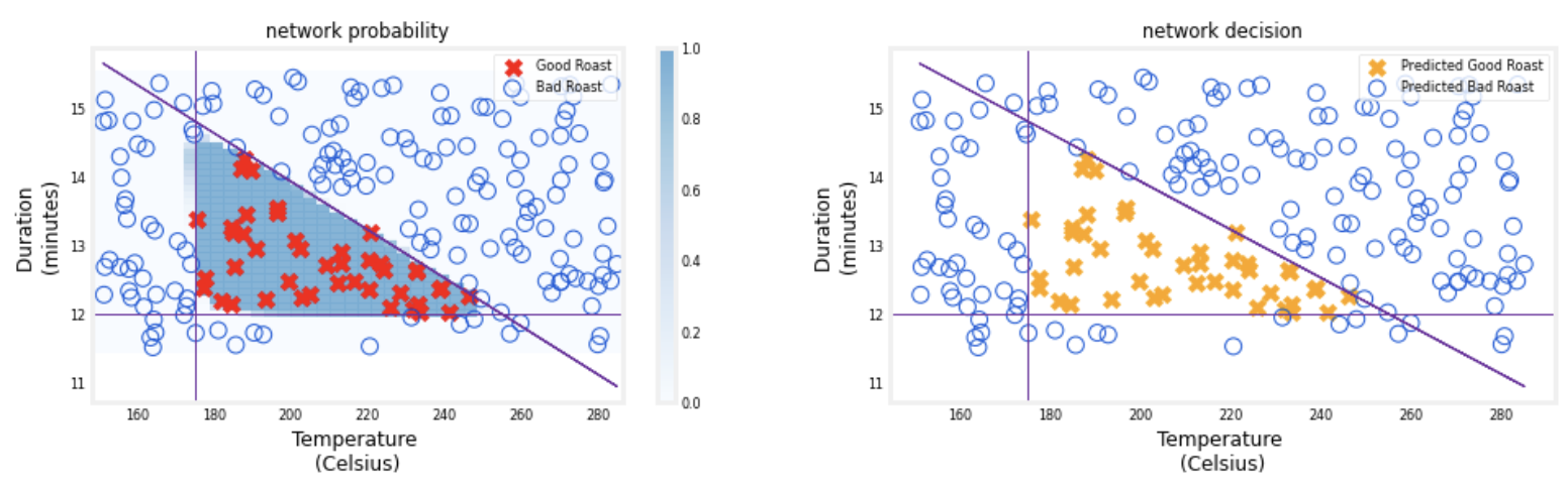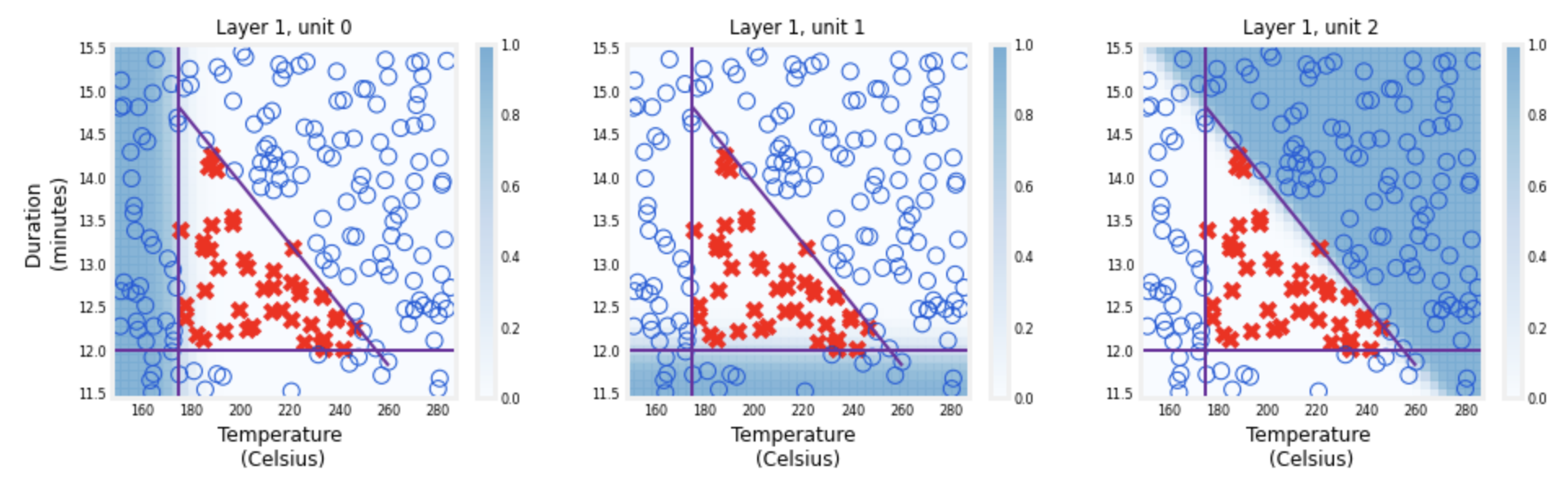 뉴런 3개에서 각각의 출력 위 plot을 보면 각각의 뉴런이 '나쁜 로스트' 지역에 대해 어떻게 책임을 지는지 설명하고 있다. 첫번째, 유닛 0에서는 온도가 너무 낮을 때 더 큰 값을 가지고, 유닛 1은 로스팅 시간이 너무 짧을 때 더 큰 값을 가짐을 보여준다. 그리고 유닛 2는 시간과 온도의 나쁜 조합에 대해 더 큰 값을 가진다. 뉴런 네트워크가 경사 하강법을 통해 이러한 함수를 스스로 학습했다는 점이 정말 놀랍다. 이 함수들은 사람이 좋은/나쁜 로스팅에 대한 결정을 내리기 위해 선택할 수 있는 유형의 생각과 매우 비슷하다.