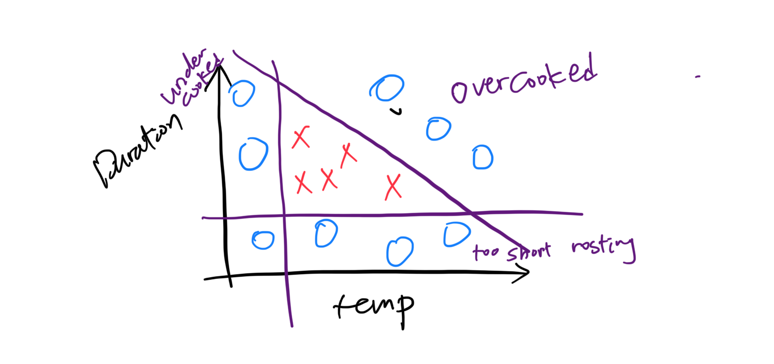 지난 내용에서 예시로 사용했던 것 보다 훨씬 많은 볶은 원두 샘플 데이터가 있다. 200개의 원두 중, 빨간색 X로 표시된 원두들이 모두 적절한 온도와 시간에 로스팅된 예시들이다. 파란색 ㅇ들은 너무 적게/오래 볶았거나, 온도가 너무 낮거나 높아서 너무 타버리거나 맛이 없어진 예시들이다.